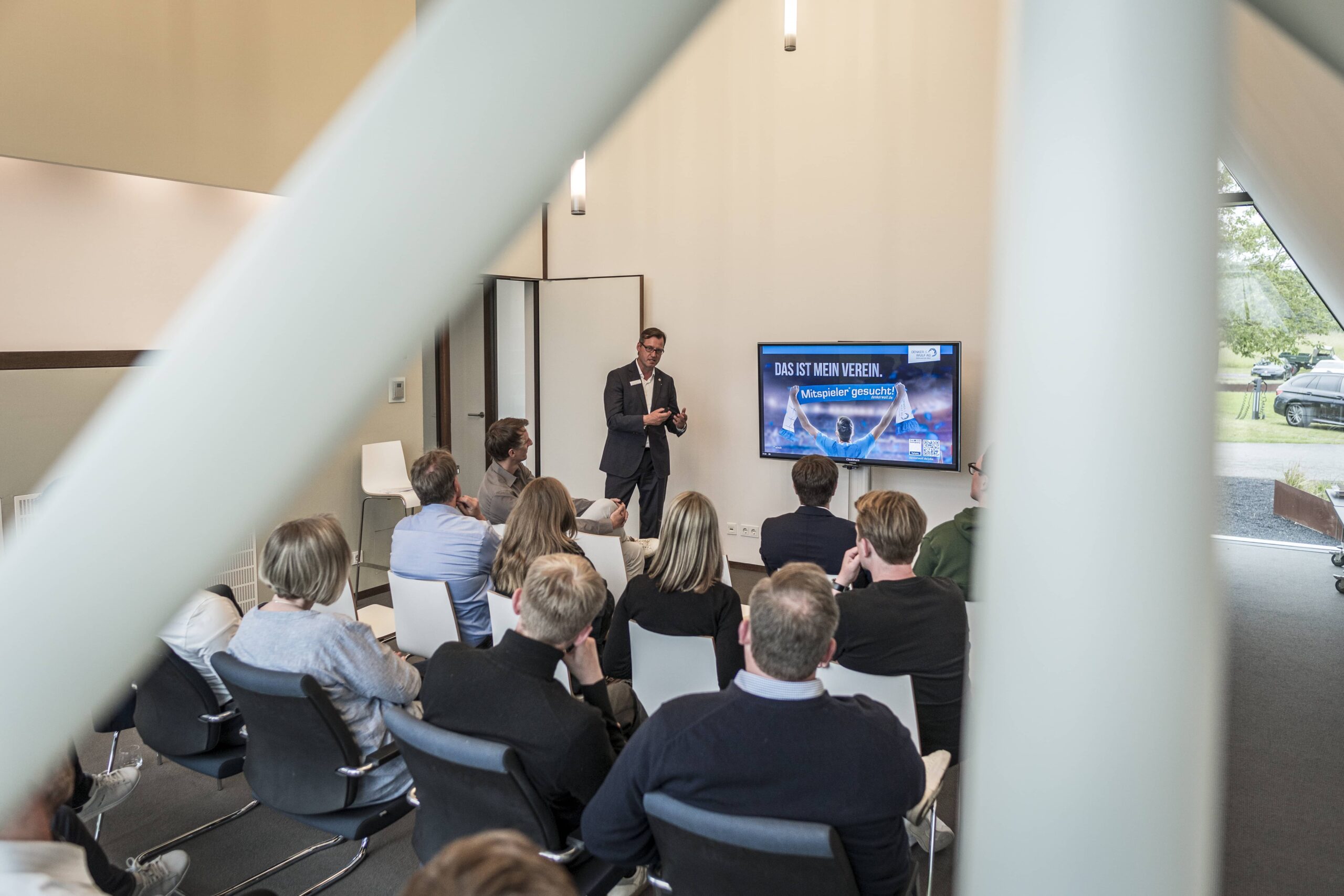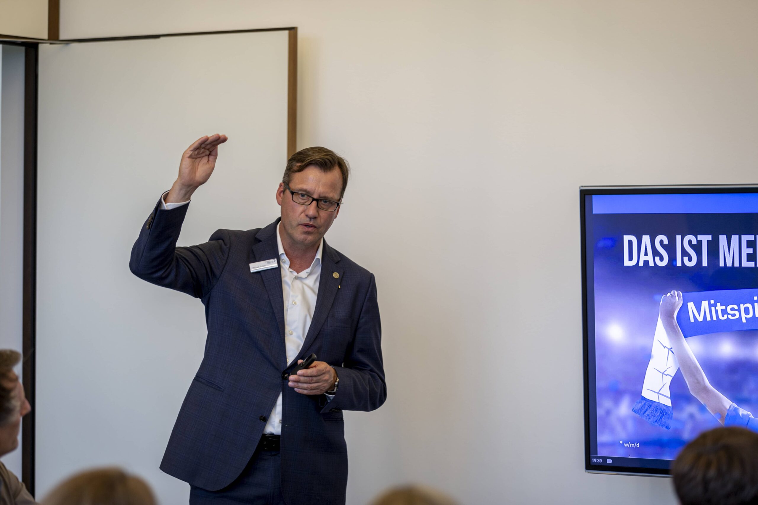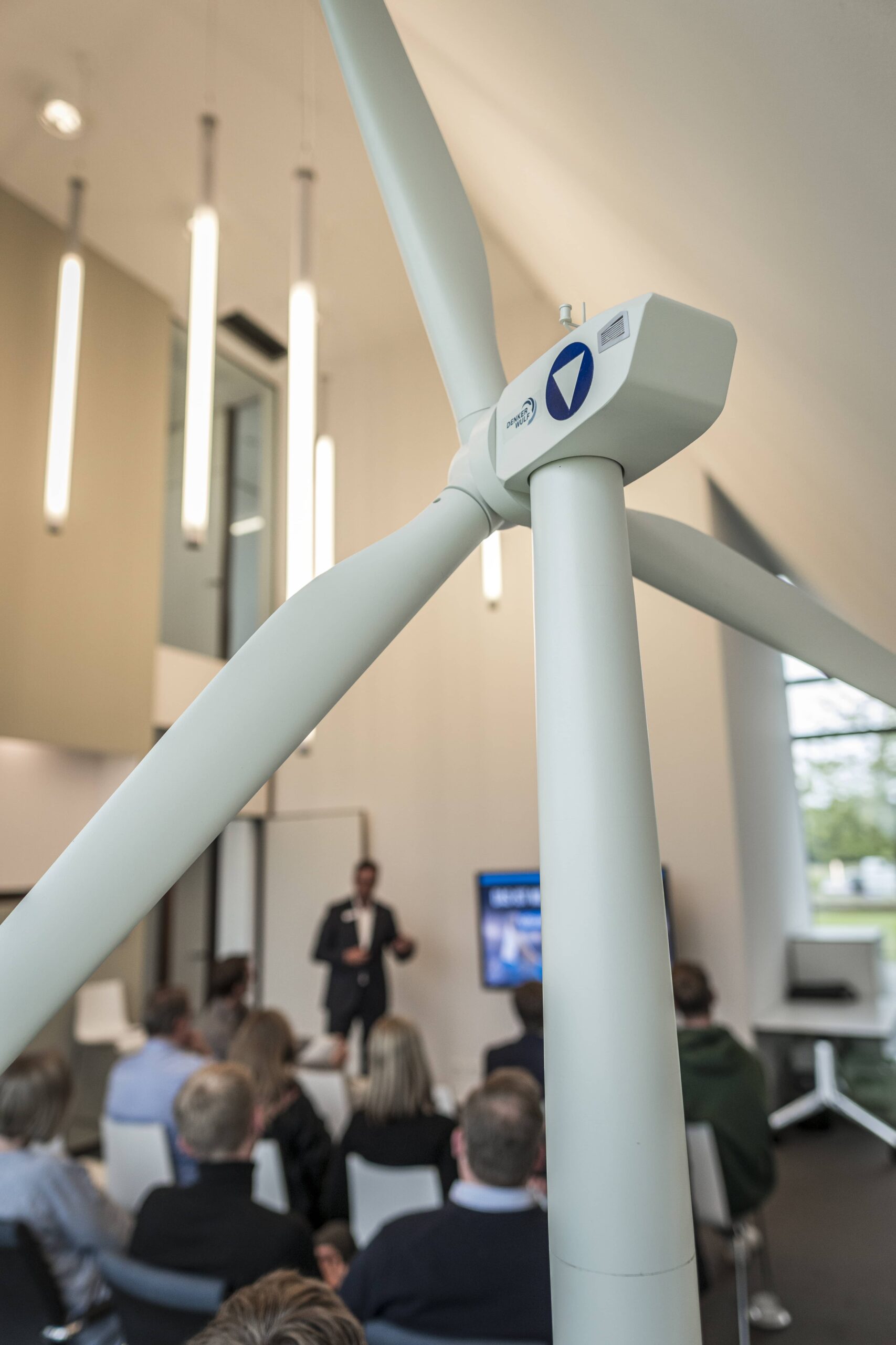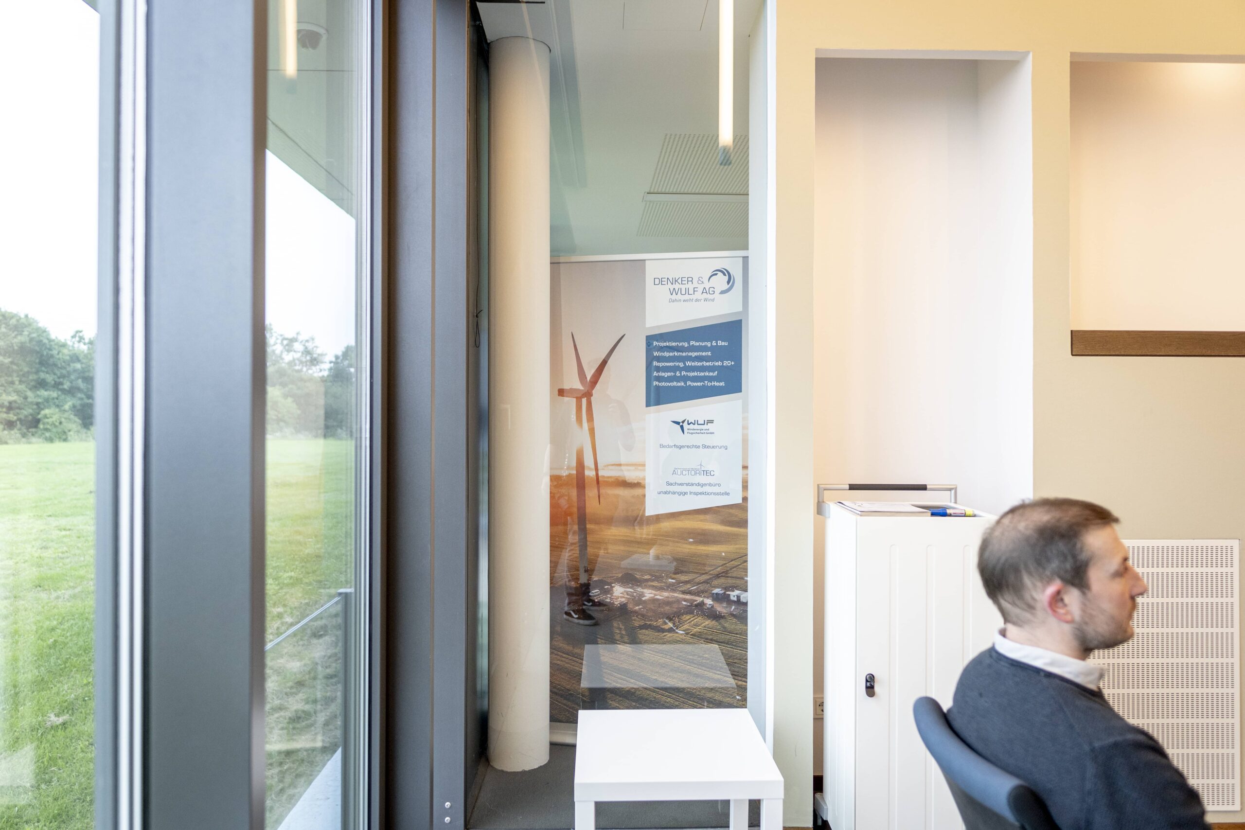 Nach einem herzlichen Empfang wurde den Wirtschaftsjunioren zunächst die Unternehmenshistorie und das kontinuierliche Wachstum der Denker & Wulf AG in einer spannenden Präsentation vorgestellt. Im Anschluss wurden die Geschäftsfelder der Windparkprojektierung, der Photovoltaikanlagen und einige innovative Projekte detailliert thematisiert. Speziell im Bereich der Förderung und Leistungsfähigkeit von Windparks entstanden zahlreiche interessierte Nachfragen, sodass sich ein interaktiver Vortrag entwickelte, in dem die präsentierten Zahlenwerke und Standortfaktoren von Windparks ausführlich analysiert und diskutiert wurden.