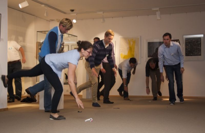 Die einladende Kundenhalle der Fördesparkasse zu Kiel bot nicht nur dem Hall geöffneter Bierflaschen ein tolles Ambiente. Auch die Ausrufe von Jubel und Verzweiflung, die über Treppenstufen springenden Golfbälle und die leidenschaftlichen Strategiediskussionen der angehenden Golfprofis schallten bei der Monatsveranstaltung September durch die Halle und zogen wiederholte Blicke des Erstaunens der Kunden an den Geldautomaten auf uns. Angeheizt wurden wir durch ein kurz-knackiges Aufwärmprogramm einer charmanten Mitarbeiterin der FIT GmbH, bei dem sich auch der zum Glück einzige kleine Zwischenfall des Abends ereignete. Erfreulicherweise erlitten weder Mensch noch Kunstwerk nachhaltige Schäden. Eine äußerst freundliche und motivierte Mitarbeiterschar der Fördesparkasse gab uns zu jedem der zu spielenden Löcher mit Humor gewürzte Anweisungen. Alle Beteiligten hatten sichtlich ihren Spaß bei der Sache.