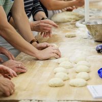 Für die Bäckerei Lyck gilt seit jeher der Grundsatz, je weniger Maschineneinsatz, desto besser. Und dieses wurde auch zum Anlass genommen eine "Challenge" zwischen uns Wirtschaftsjunior*innen und deren Azubis an diesem Abend durchzuführen. Beide Teams erhielten ein Rezept und durften selbst Hand anlegen und backen.
